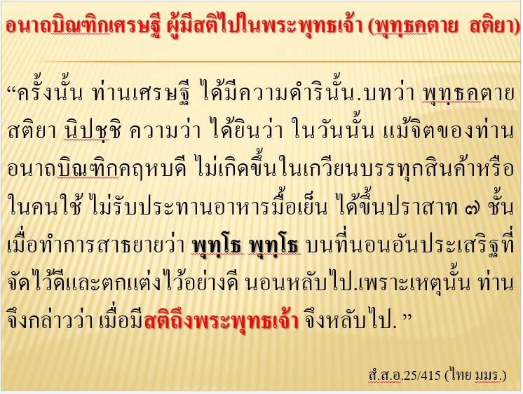 หลักฐานตามคัมภีร์ อุบาสกคนแรกที่เจริญพุทธานุสสติ คือท่าน อนาถบิณฑิกเศรษฐี